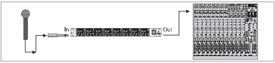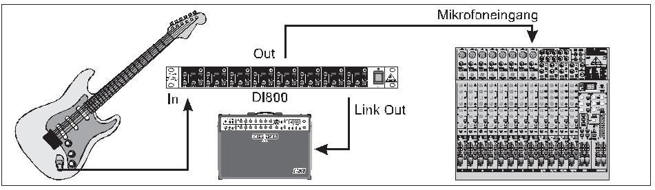 Minderwertige Mikrofone haben häufig einen unsymmetrischen, hochohmigen Ausgang. Mit der D1800 können lange Kabellängen zum Mischpult ohne Gefahr des Einstreuens von Brumm- oder sonstigen Störsignalen realisiert werden. Dazu muss lediglich das Mikrofon an den Eingang der Dl-Box und deren Ausgang an den Mikrofoneingang des Mischpults angeschlossen werden.