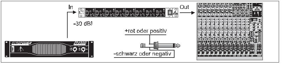 Manchmal soll ein Signal hinter dem Verstärker abgegriffen werden, um dessen Klang mit zu übertragen, obwohl lediglich ein Lautsprecherausgang vorhanden ist. Mit Hilfe des -30 dBSchalters der D1800 können Sie Ihr Mischpult selbst an einen Verstärkerausgang mit 3.000 Watt an 4 Ohm anschließen, ohne befürchten zu müssen, dass die D1800 dadurch überlastet wird! Wenn Sie eine Röhrenendstufe benutzen, sollten Sie am LINK-Ausgang eine Lautsprecherbox oder einen anderen, entsprechenden Lastwiderstand anschließen.