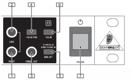 5.: Mit dem GND LIFT-Schalter können Sie die Masse des Eingangs und des Ausgangs vollständig voneinander trennen. Je nachdem wie die angeschlossenen Geräte geerdet sind, lassen sich damit Brummgeräusche oder Masseschleifen verhindern. In gedrückter Stellung (GND LIFT) ist die Masseverbindung unterbrochen (LED leuchtet rot). In der Schalterstellung PHANTOM OR MAINS POWER ON (GND LIFT nicht gedrückt) leuchtet die LED grün.