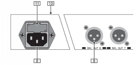 8.: Die BAL OUT-Anschlüsse (1 - 8) sind die symmetrischen Ausgänge der Kanäle 1 bis 8 mit Mikrofonpegel. Der Anschluss sollte über ein symmetrisches Mikrofonkabel hoher Qualität erfolgen.