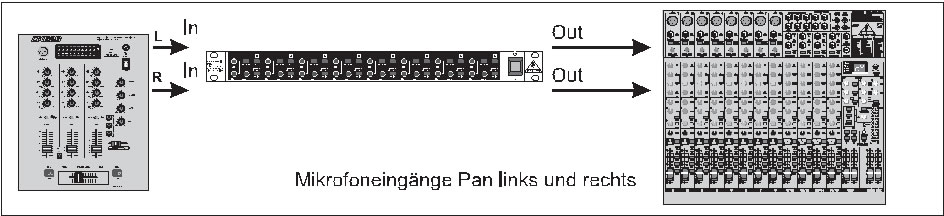 Diese Konfiguration empfiehlt sich bei Verwendung eines Keyboards, DJ-Mixers oder anderen Stereo- bzw. Monosignalquellen mit Line-Pegel. Aufjeden Fall aber bei Verwendung langer Kabel, z. B. zum Saalmischer. Das Signal kann über den LINK-Ausgang zu einem anderen Verstärker durchgeschleift werden, wenn der Keyboarder, DJ usw. ein Monitorsignal haben möchte, das unabhängig vom eigentlichen Saalmix ist.